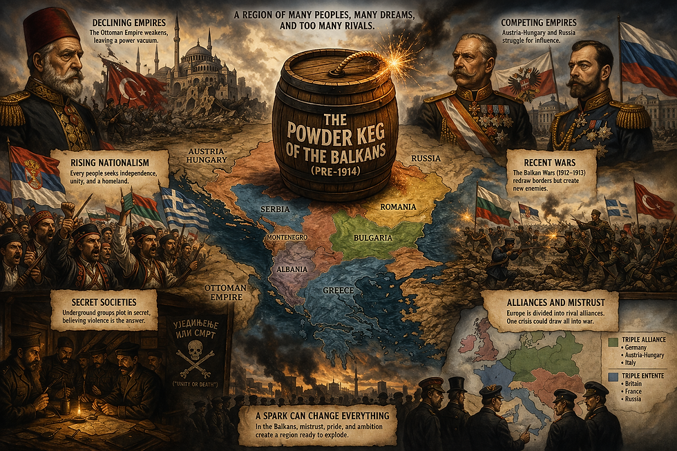 The decline of Ottoman authority created what historians call a power vacuum—a situation where no single power is strong enough to maintain order. In the Balkans, this vacuum allowed new nations to rise, but it also removed the structure that had kept rivalries in check. Competing ambitions, unclear borders, and outside interference combined to create a region filled with tension and uncertainty. By the early 1900s, the Balkans had become one of the most unstable areas in Europe, where even a small spark could ignite a much larger conflict.